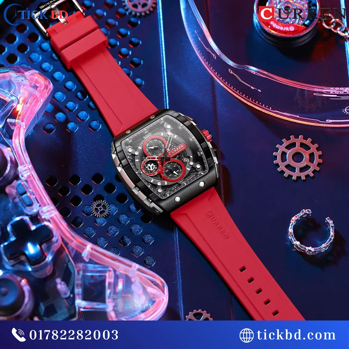 The CURREN 8442 is a men’s luxury sports quartz chronograph watch characterized by its large rectangular/tonneau-shaped case and multi-functional dial. It is designed for everyday use, combining a military-inspired aesthetic with practical features like a silicone strap and 3 ATM water resistance.