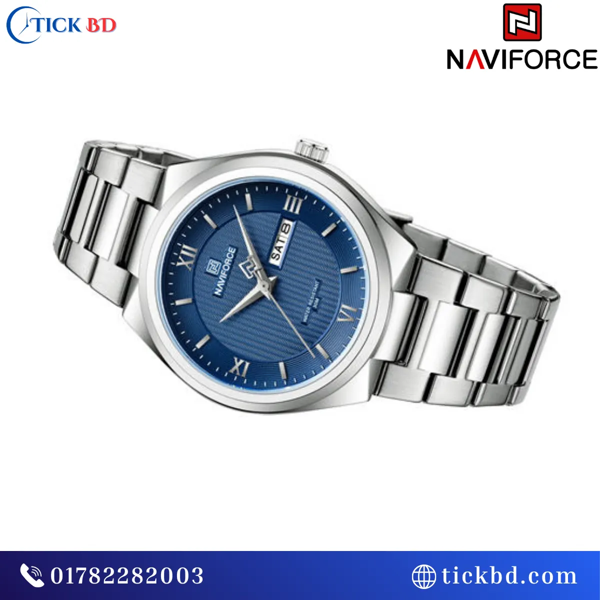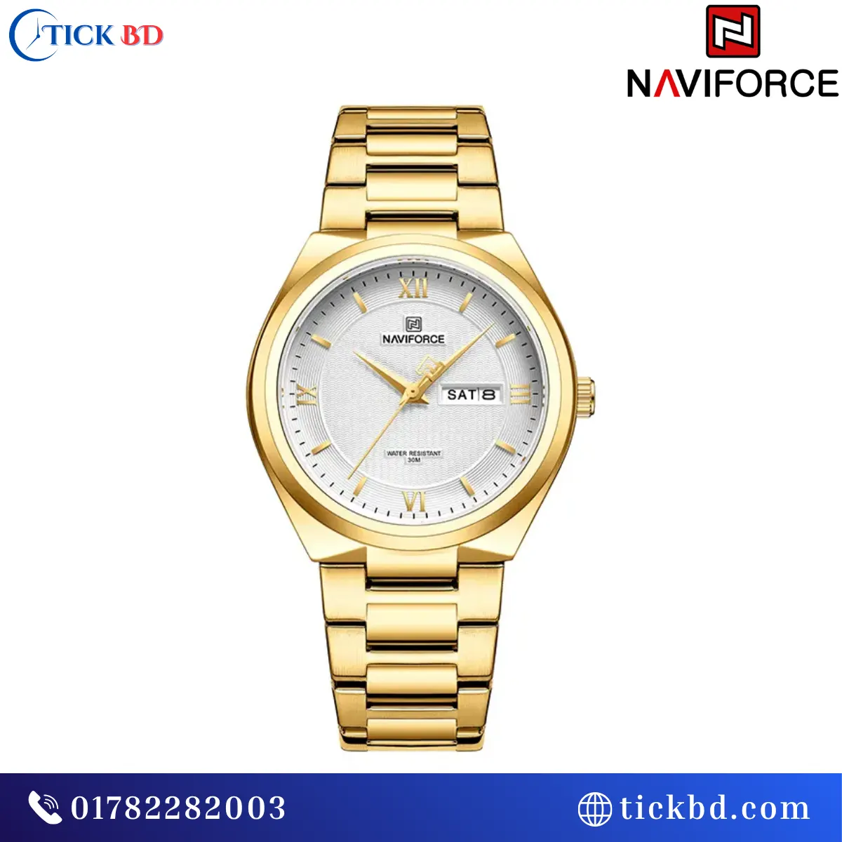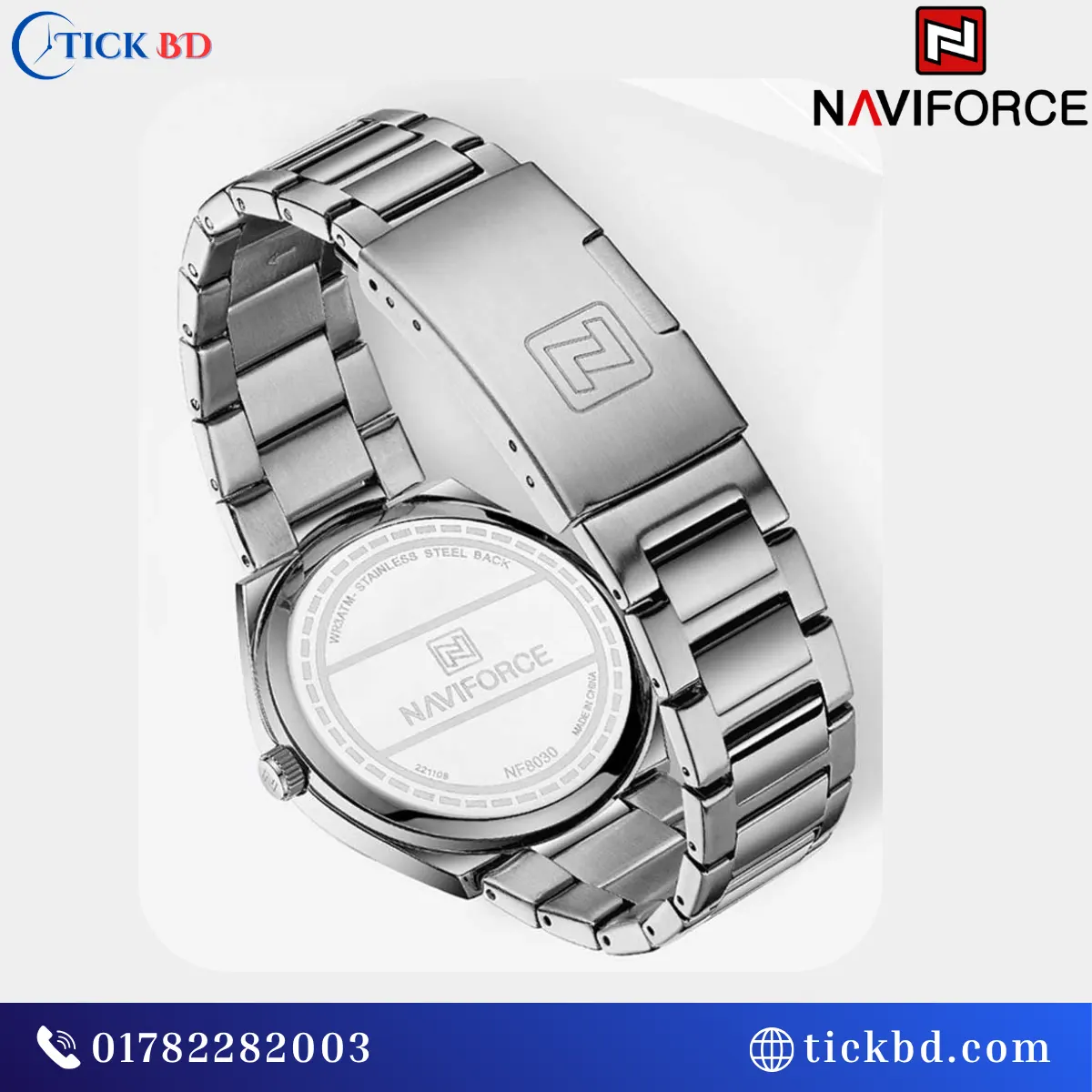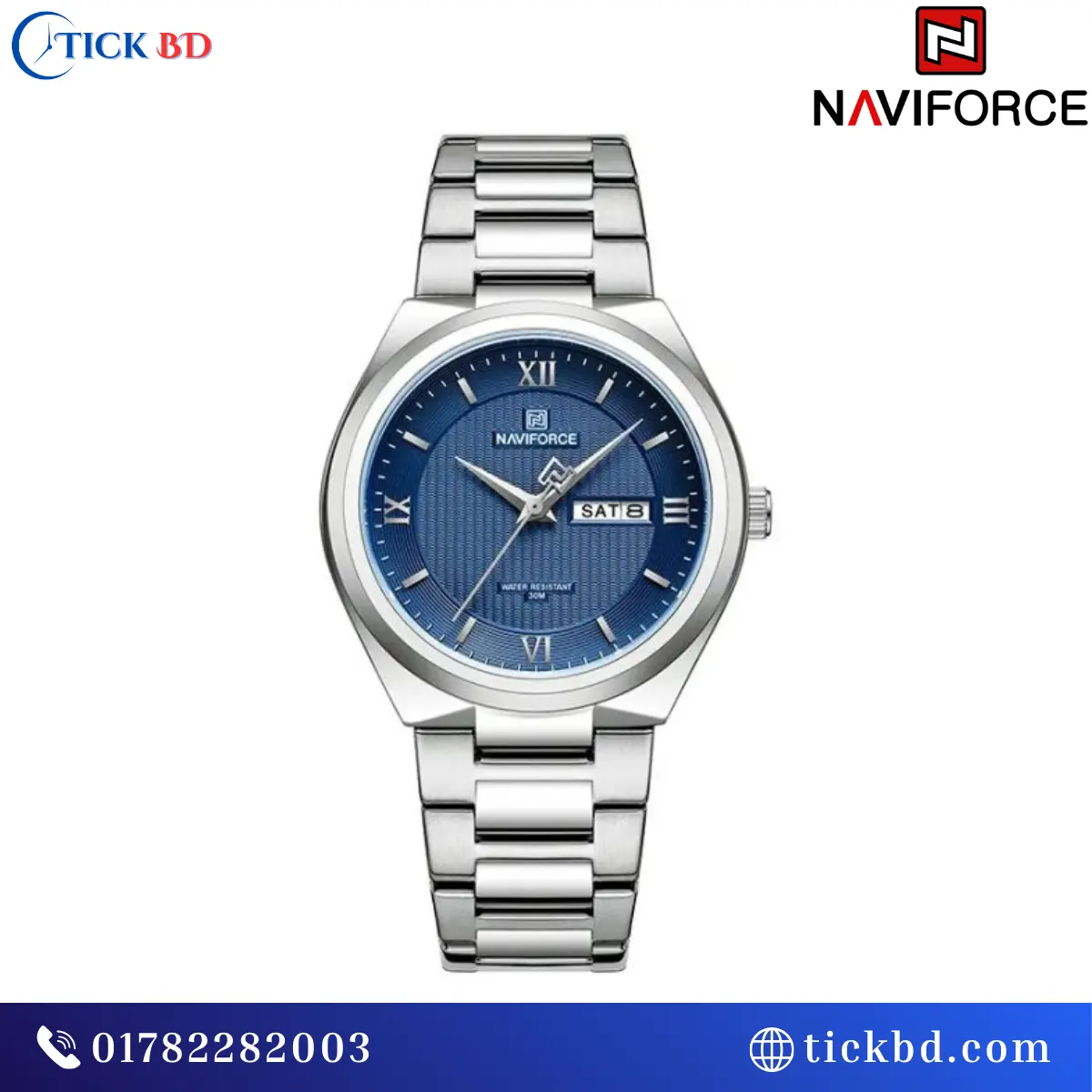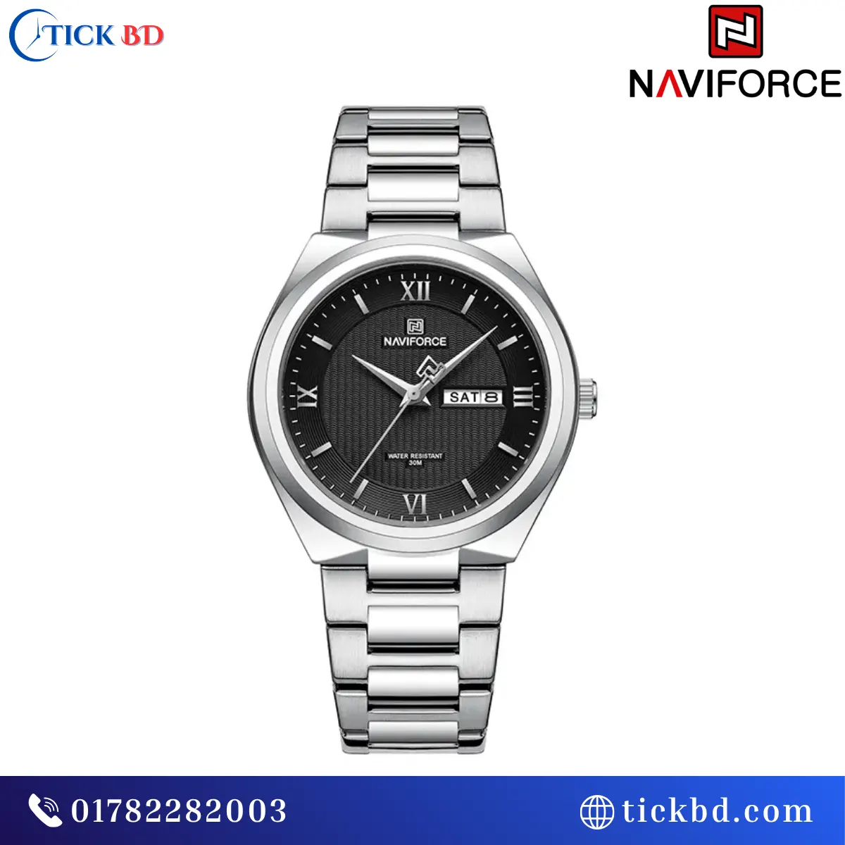 The Naviforce NF8030 Men’s Quartz Watch is available in six stylish color combinations, mainly featuring stainless steel straps paired with different dial colors: