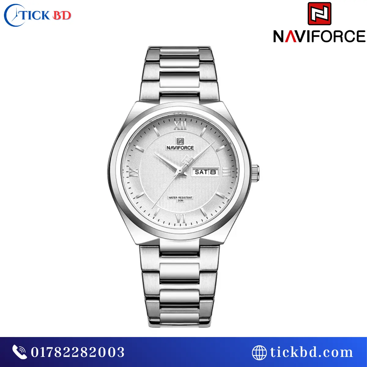 The Naviforce NF8030 Men’s Quartz Watch is a stylish and versatile timepiece designed for modern men. With its sleek 38.5mm dial, premium stainless steel strap, and elegant Roman numeral markers, it perfectly fits both business and casual wear. The wave-textured dial adds a unique visual appeal, while the slim 9mm case ensures comfortable daily use.